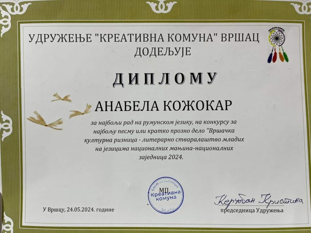 Udruženje „Kreativna komuna“ Vršac, pod pokroviteljstvom Ministarstva za ljudska i manjinska prava, priredila je višejezični konkurs literarnog stvaralaštva mladih na jezicima nacionalnih manjina. U kategoriji pisanja poezije, Anabela Kožokar (IV5) je osvojila I mesto.