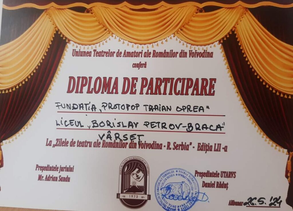 U petak 17. maja, na bini velikog amfiteatara naše škole, prikazana je bajka „Făt-Frumos și prințesa Lumina Dimineții a împăratului Soare“ – „Lepi-Mladić i princeza Jutarnja Svetlost kralja Sunca“. Predstava je realizovana u saradnji sa fondacijom „Protopop Traian Opera“, a deo je programa koji je prikazan na Danima amaterskih pozorišta Rumuna iz Vojvodine.