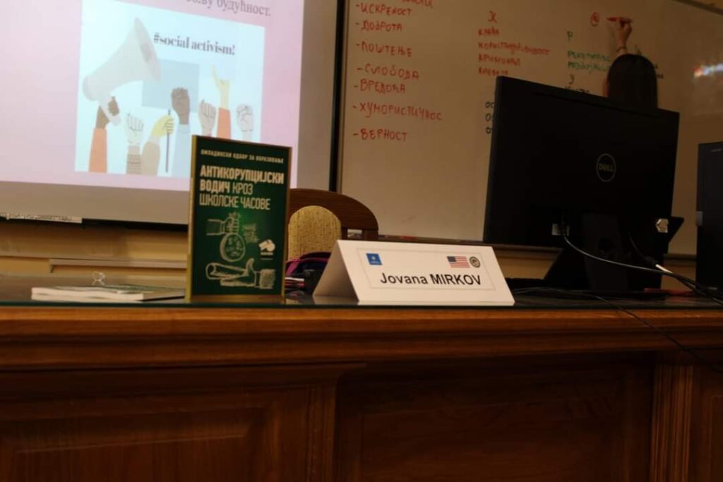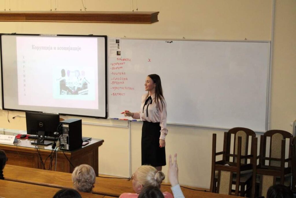 Ona je u četvrtak 30. maja u sklopu navedenog projekta održala svoju prezentaciju đacima naše škole, kojom je pokušala da im približi načine na koje sve funkcioniše korupcija, uz navođenje mogućnosti pomoću kojih se možemo boriti protiv nje.