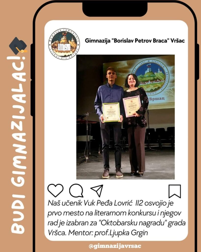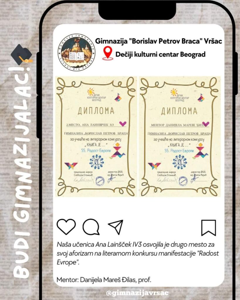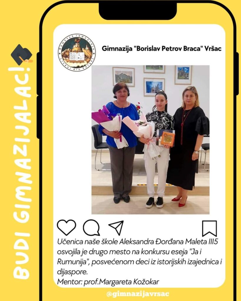 A student of our school, Aleksandra Djordjana Maleta (III5), won second place in the essay contest “I and Romania”, dedicated to children from historical communities and the diaspora. On this occasion, the Consul General of Romania in Vršac, Anka Korfu, invited Alexandra and her mentor Prof. Margareta Kožokar to a reception at the Consulate in Vršac. The reception was also attended by Daniel Bala, acting head of mission at the General Consulate of Romania in Vršac. We would like to take this opportunity to thank them for the nice gifts and reception.
